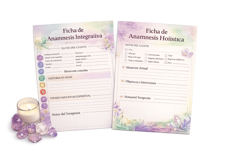 Fichas terapéuticas, mapas completos de chakras, guías profesionales de sesión y protocolos energéticos listos para usar en consulta.